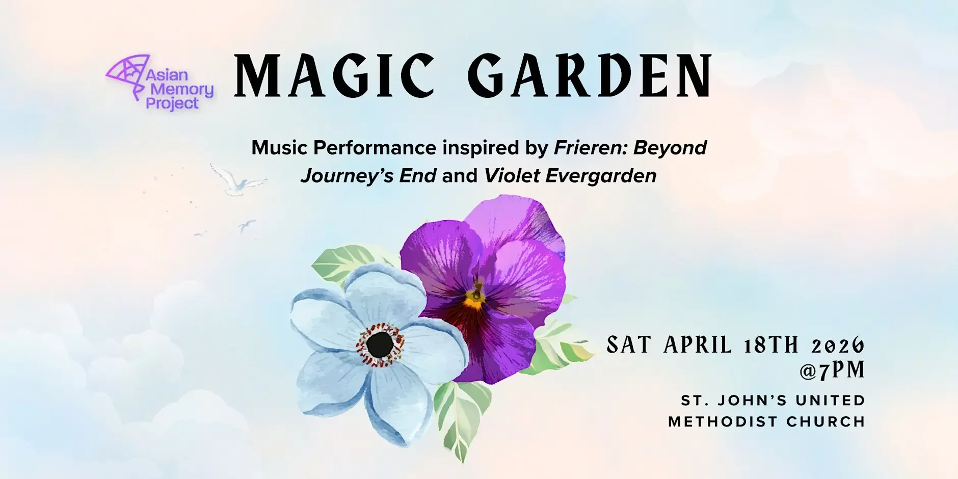 Join AMP for Magic Garden, an evening of chamber music inspired by Evan Call's scores for the series Frieren: Beyond Journey's End & Violet Evergarden. Inspired by the passage of time, adventures, and connections to loved ones, the performance will feature arrangements and original music composed by Daniel Kim for flute, violin, and piano.